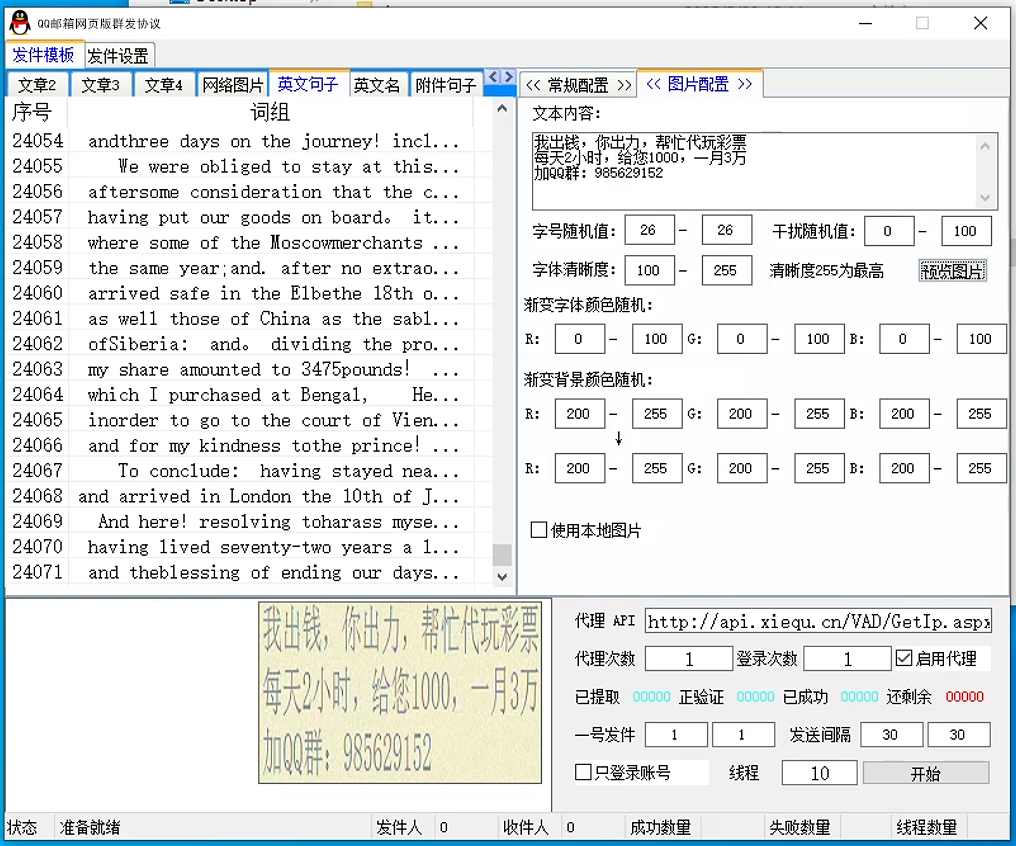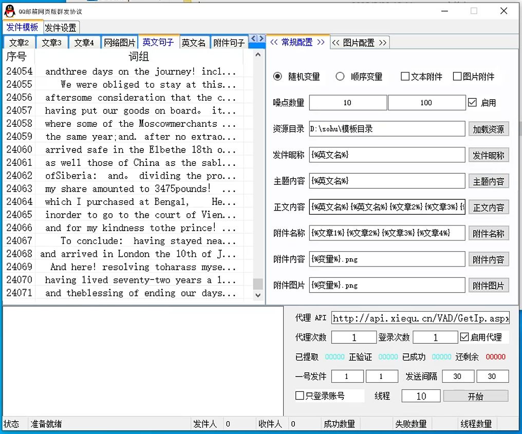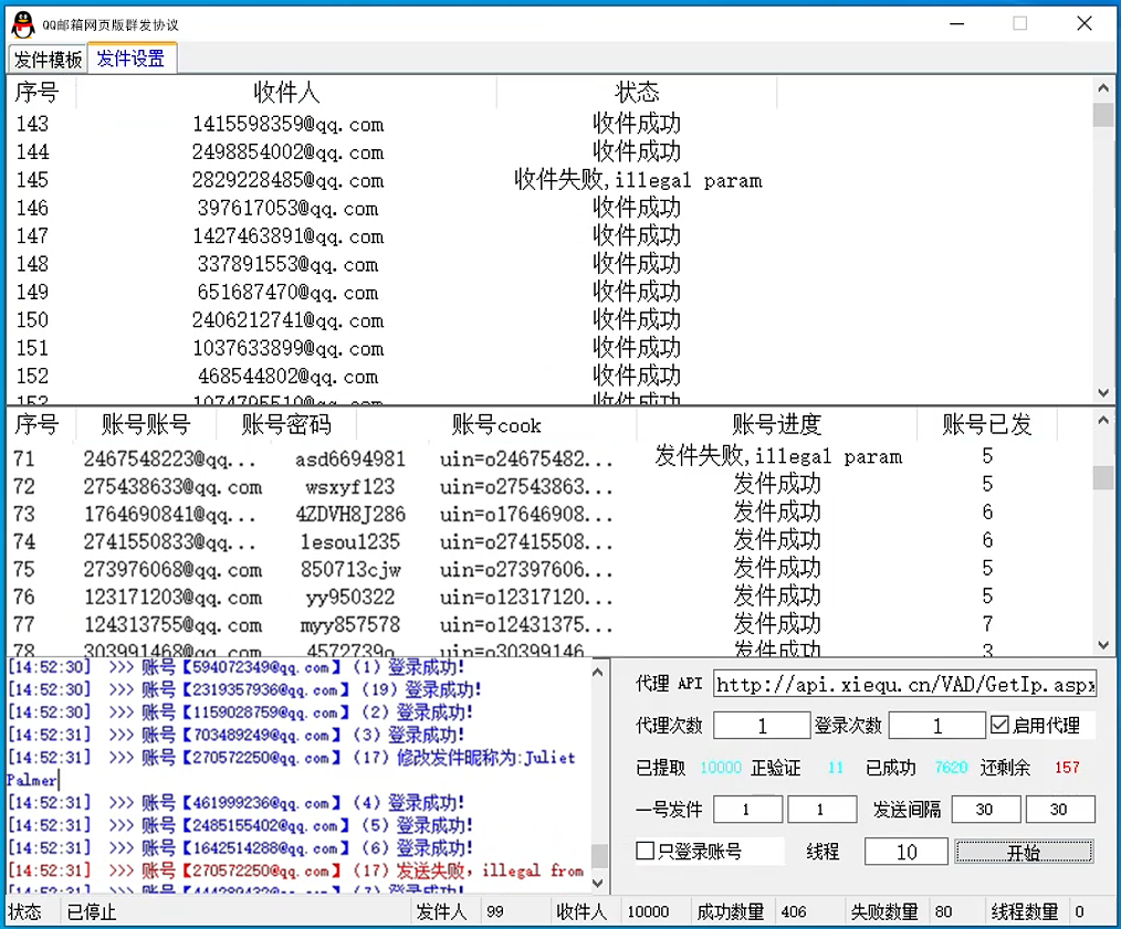 软件支持API代理IP,支持导入导出,发送设置,多线程,发送间隔,发送数量,时速3万